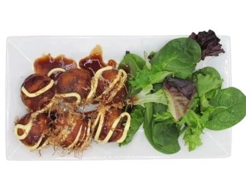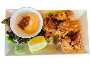 Rice, fried chicken, sesame seeds, green onions, house original sauce