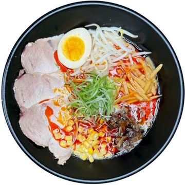 Pork broth and chashu, miso, seasoned bamboo shoots, bean sprouts, black mushrooms, corn, shredded green onions and bell pepper