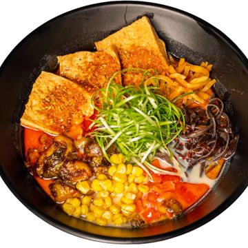 Vegan broth, soy milk, spicy oil, seasoned fried tofu, seasoned bamboo shoots, black mushrooms, shredded green onions, brusell sprout and bell pepper