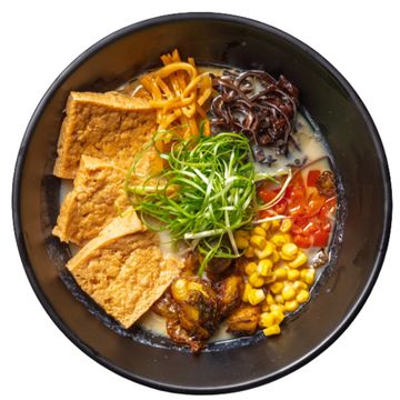 Vegan broth, soy milk, seasoned fried tofu, seasoned bamboo shoots, black mushrooms, shredded green onions, brussels sprout and bell pepper